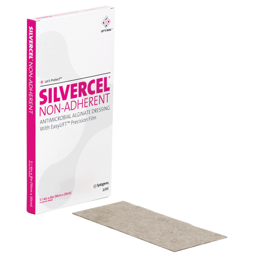 SILVERCEL NON-ADHERENT Hydro-Alginate Antimicrobial Dressing with Silver with EasyLIFT Precision Film Technology is a non-woven pad composed of alginate, carboxymethylcellulose (CMC) and silver coated nylon fibers, with a non-adherent wound contact layer.